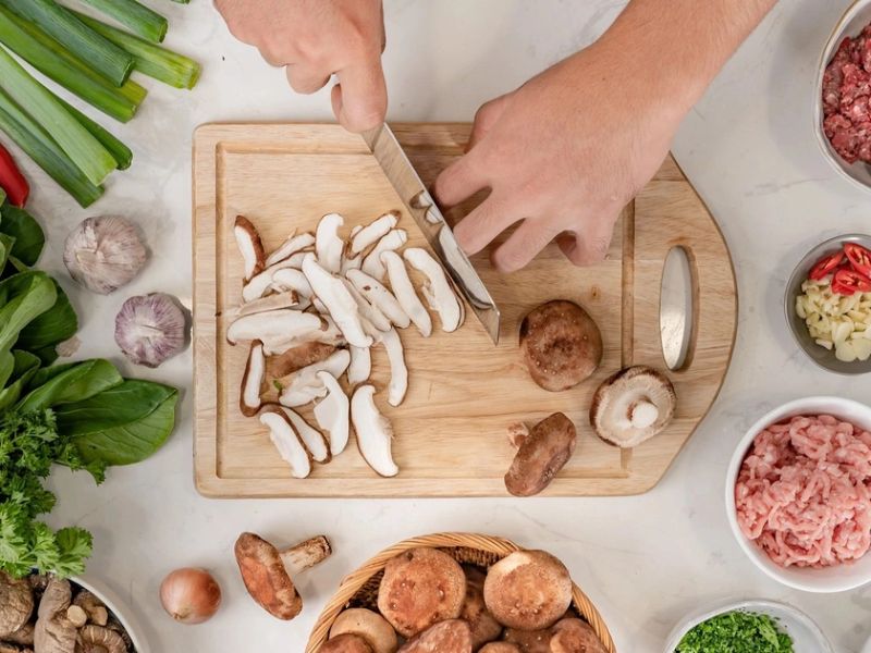 - Sơ chế nấm đông cô tươi: Với nấm đông cô tươi, bạn không nên ngâm trong nước vì sẽ khiến nấm nhanh bị nhũn khi nấu. Thay vào đó, hãy rửa nhẹ nhàng dưới vòi nước và loại bỏ các phần hư, dập hoặc bẩn. Nếu cuống nấm quá cứng, bạn nên cắt bỏ để tránh ảnh hưởng đến độ mềm của món ăn. Ngược lại, nếu cuống còn mềm, giữ lại để chế biến cùng thân nấm, tận dụng tối đa nguyên liệu. So với nấm khô, việc sơ chế nấm tươi cần cẩn thận hơn để giữ được độ tươi ngon và kết cấu giòn dai tự nhiên.