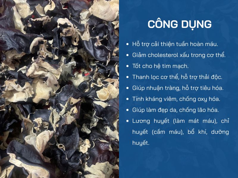 Thêm vào đó, lớp keo thực vật dồi dào trong mộc nhĩ có đặc tính hấp thu độc tố và kim loại nặng, giúp làm sạch đường ruột và hỗ trợ chức năng gan. Đồng thời, mộc nhĩ còn chứa các hoạt chất chống oxy hóa, kháng khuẩn, tăng cường miễn dịch, làm chậm quá trình lão hóa, và được ghi nhận có khả năng hỗ trợ ức chế sự phát triển của một số dòng tế bào ung thư.