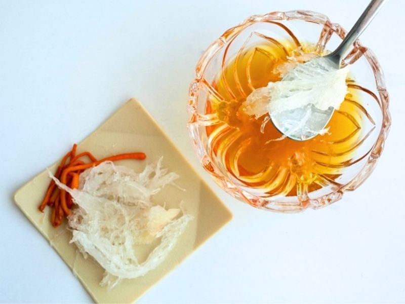 - Ngâm mật ong: Đông trùng hạ thảo ngâm mật ong là bài thuốc giúp nâng cao sức đề kháng, hỗ trợ phòng ngừa cảm cúm, viêm họng. Dùng khoảng 10–15g đông trùng hạ thảo khô, ngâm với 300ml mật ong nguyên chất trong hũ thủy tinh, đậy kín và bảo quản nơi mát trong 7 ngày là có thể dùng. Mỗi lần dùng 1–2 muỗng cà phê pha nước ấm.