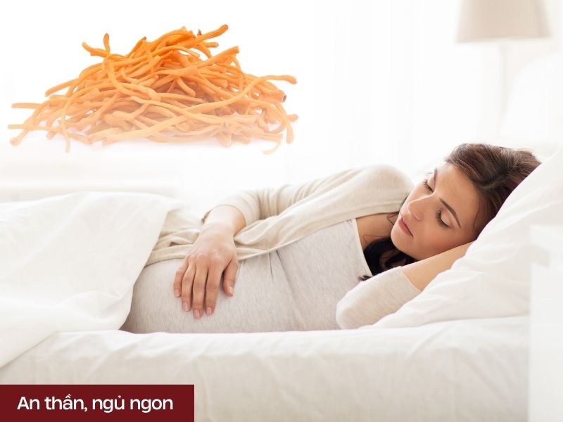 Một trong những công dụng nổi bật của Đông trùng Hạ thảo với phụ nữ mang thai chính là giúp an thần và cải thiện giấc ngủ. Trong suốt thai kỳ, đặc biệt là giai đoạn đầu và cuối thai kỳ, mẹ bầu dễ rơi vào trạng thái căng thẳng, lo lắng, mất ngủ do thay đổi nội tiết tố và áp lực về tâm lý. Việc sử dụng Đông trùng Hạ thảo (theo chỉ định của bác sĩ) có thể hỗ trợ điều hòa thần kinh, giúp mẹ bầu ngủ ngon hơn, tinh thần thoải mái hơn, từ đó giảm nguy cơ trầm cảm thai kỳ. Ngoài ra, Đông trùng Hạ thảo còn giúp tăng cường hệ miễn dịch, hỗ trợ tiêu hóa và hấp thụ dinh dưỡng tốt hơn, góp phần vào sự phát triển toàn diện của thai nhi.