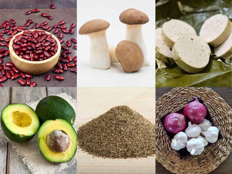 - Chuẩn bị các nguyên liệu khác: Nấm đùi gà rửa sạch bằng nước muối loãng, luộc sơ khoảng 3–5 phút cho chín rồi cắt nhỏ. Giò chay và bơ chín cắt miếng vừa. Hành tím và tỏi băm nhuyễn.