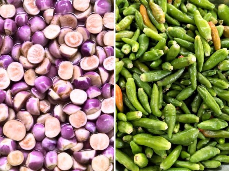 Trước tiên, bạn chuẩn bị sẵn một thau nước muối loãng để ngâm cà pháo tím. Nên dùng muối hạt thay vì muối i-ốt thông thường – vì độ mặn cao hơn, giúp tiết kiệm và hiệu quả hơn khi ngâm. Cà pháo tím rửa sạch, cắt bỏ cuống rồi chẻ đôi hoặc chẻ tư tùy theo kích thước từng quả. Ngay sau khi cắt, nhớ thả cà ngay vào nước muối để giữ màu sắc tươi đẹp, tránh bị thâm đen.