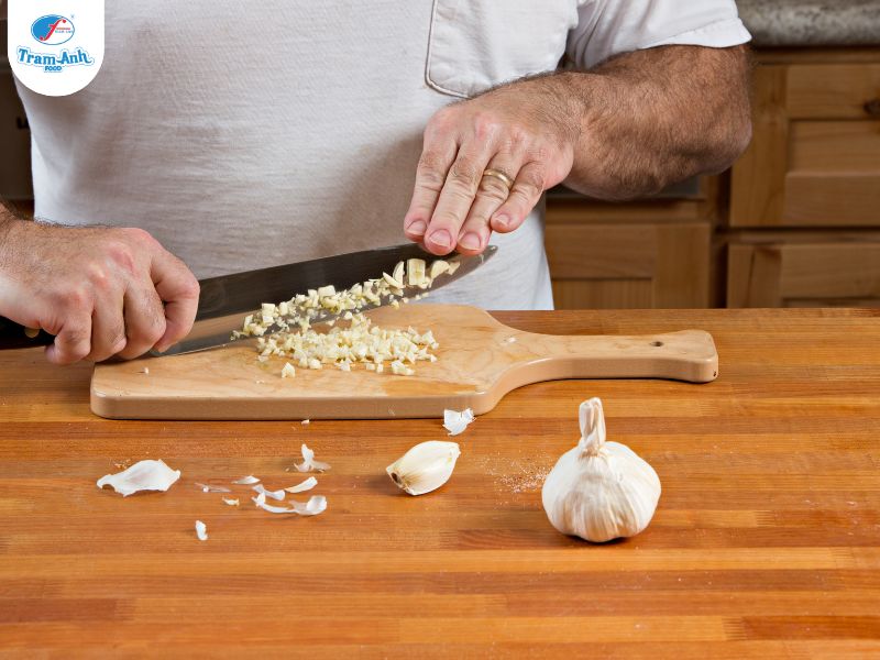 Tiếp theo, băm nhuyễn tỏi và ớt tùy vào mức độ ăn cay của gia đình mà bạn có thể điều chỉnh lượng ớt cho phù hợp.