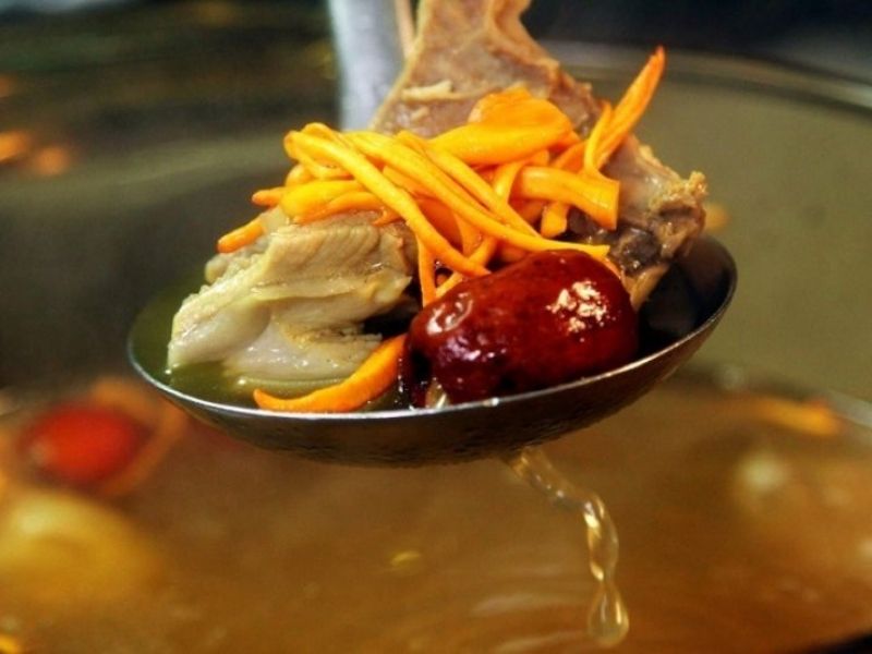 Khi món gà hầm đông trùng hạ thảo đã được nấu đủ thời gian, bạn nêm nếm lại gia vị cho vừa khẩu vị. Có thể thêm một chút đường phèn hoặc đường trắng để làm dịu vị, giúp nước hầm ngọt thanh và dễ ăn hơn. Lúc này, thịt gà đã mềm nhưng vẫn giữ độ ngọt tự nhiên, trong khi các nguyên liệu như đông trùng hạ thảo, táo đỏ, kỷ tử, hạt sen và nấm cũng chín mềm, thấm vị, hòa quyện vào nước dùng trong vắt, đậm đà và bổ dưỡng.