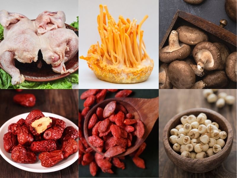 - Khi nước đã sôi và sạch bọt, bạn cho vào nồi các nguyên liệu bổ dưỡng như: gừng thái lát, tỏi băm, táo đỏ, kỷ tử, hạt sen và nấm đông cô. Những thành phần này không chỉ giúp tăng hương vị cho món ăn mà còn bổ sung nhiều dưỡng chất cho sức khỏe.