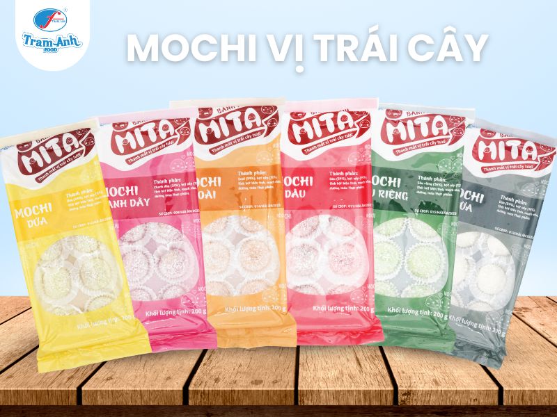 - Mochi Mita: Là một phiên bản hiện đại của mochi, đa dạng hương vị trái cây tươi (Mochi xoài, Mochi sầu riêng, Mochi dừa, Mochi dâu, Mochi dứa) và thường có nhiều màu sắc bắt mắt. Mochi vị trái cây thu hút giới trẻ và thường được dùng trong các bữa tiệc trà hoặc làm quà tặng đặc biệt.