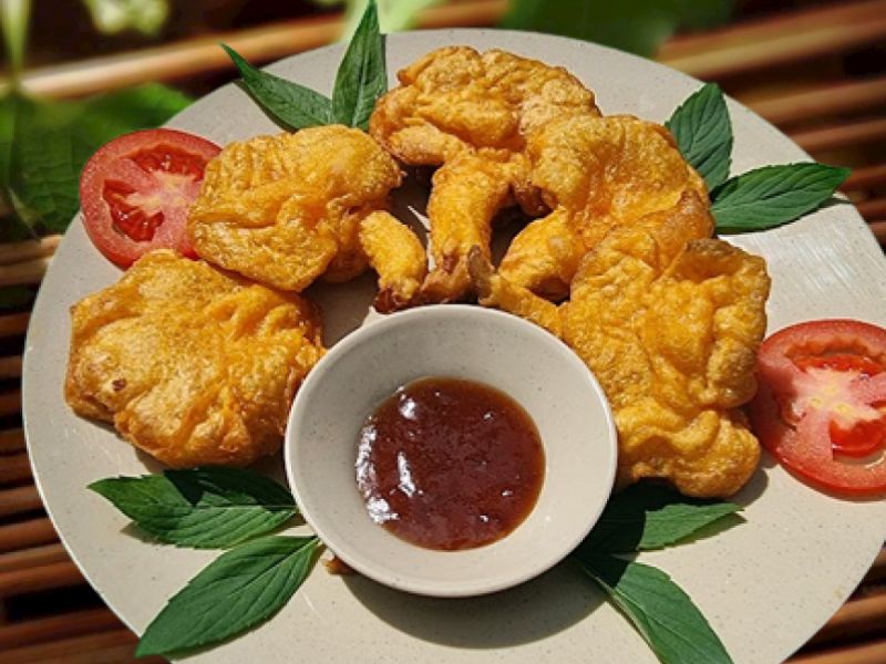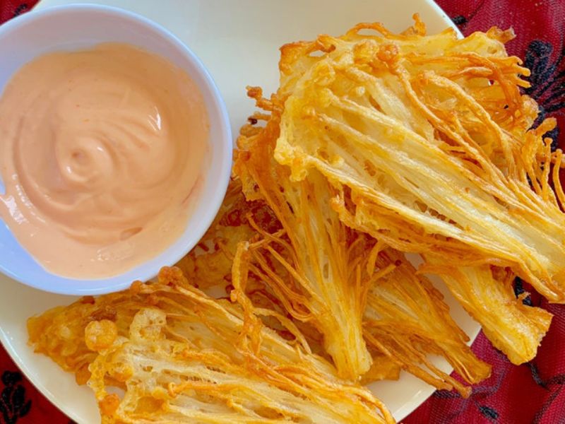 Nấm bào ngư chiên giòn – giòn rụm bên ngoài, mềm ngọt bên trong, chấm cùng sốt chua ngọt đậm đà, đảm bảo ăn là ghiền.