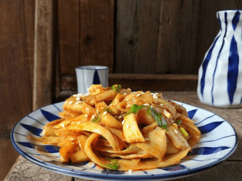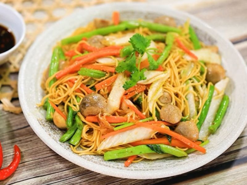 - Bước 5: Thêm đậu hũ chiên vào chảo, nêm lại gia vị (muối, hạt nêm chay), sau đó cho mì đã luộc vào xào đều tay. Cuối cùng, múc ra dĩa, rắc chút tiêu và ngò lên trên cho dậy mùi thơm.
