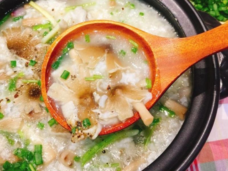 - Nấu cháo: Khi nấm đã chín, cho phần nấm xào vào nồi cháo, khuấy nhẹ tay, nêm lại gia vị vừa ăn.