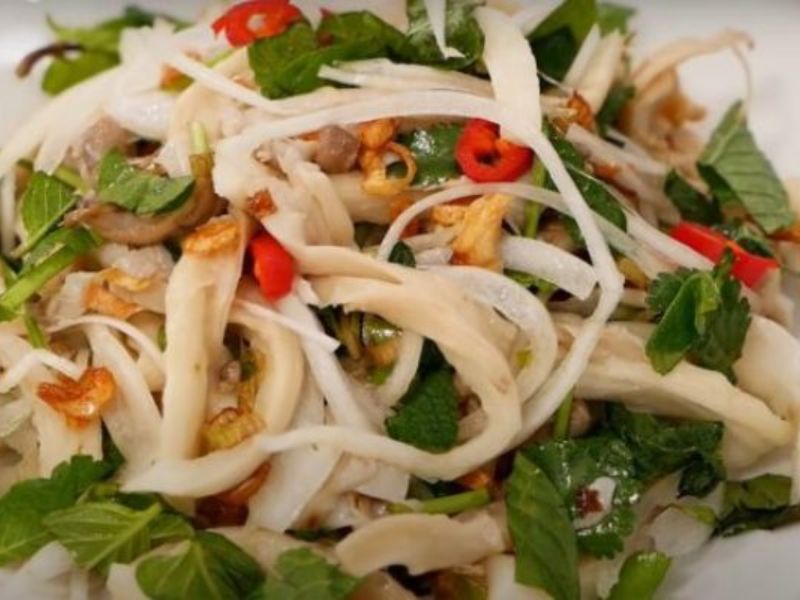- Trộn gỏi: Cho tất cả nguyên liệu vào tô lớn, rưới nước sốt lên, trộn đều tay. Bày ra đĩa, rắc thêm đậu phộng rang, rau răm và thưởng thức cùng bánh phồng tôm chay.