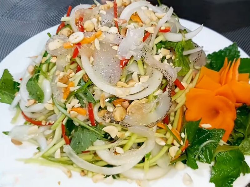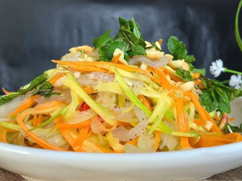 Gỏi sứa xoài xanh là một món khai vị hoặc món ăn kèm cực kỳ hấp dẫn, nổi tiếng với sự kết hợp hài hòa giữa vị chua, cay, mặn, ngọt và đặc biệt là độ giòn sần sật đặc trưng. Món ăn này không chỉ kích thích vị giác mà còn mang lại cảm giác thanh mát, rất phù hợp cho những ngày nóng bức hoặc trong các bữa tiệc.